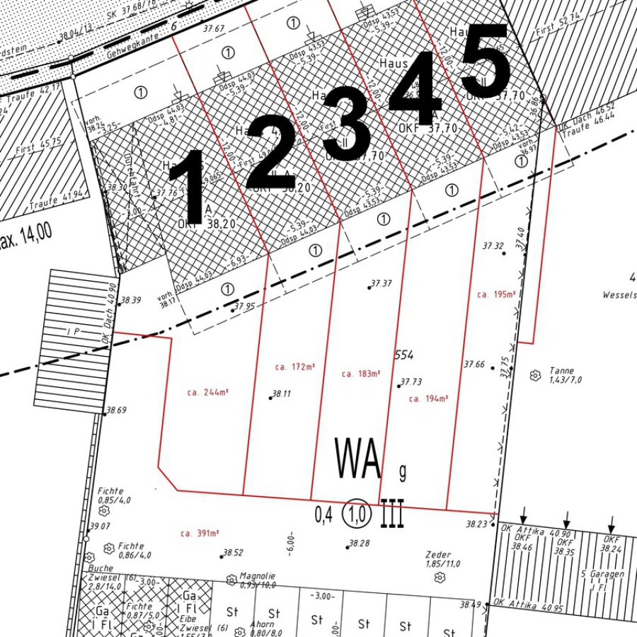Das Baugrundstück liegt sehr zentral, trotzdem ruhig und mit Grün in der direkten Umgebung.